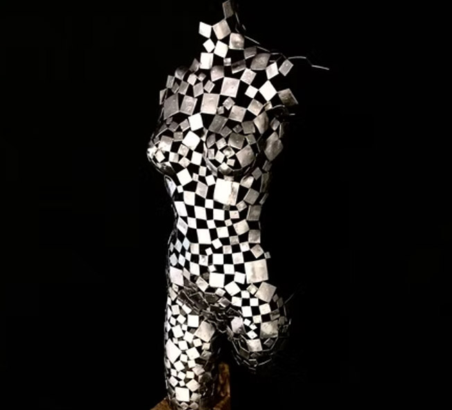 Nel Vuoto (2018) è una scultura in acciaio inox, posta su una base in legno di larice antico (40x162x33 cm). Collocata in giardino, diventa un punto focale che unisce la forza del metallo alla delicatezza delle forme femminili. Il contrasto tra materia e natura dona allo spazio verde un’atmosfera elegante e senza tempo.