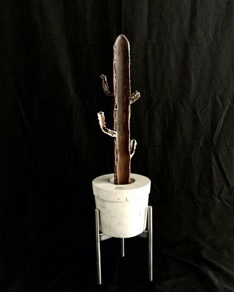 Creato nel 2020 e oggi parte di una collezione privata a Pavia, il Cactus è in acciaio corten, rame, ottone, acciaio inox e cemento (23x93x23 cm). La scultura, collocata nel giardino, introduce una nota contemporanea e originale: una forma vegetale reinventata che dialoga con piante e fiori reali, arricchendo lo spazio verde con carattere e design.